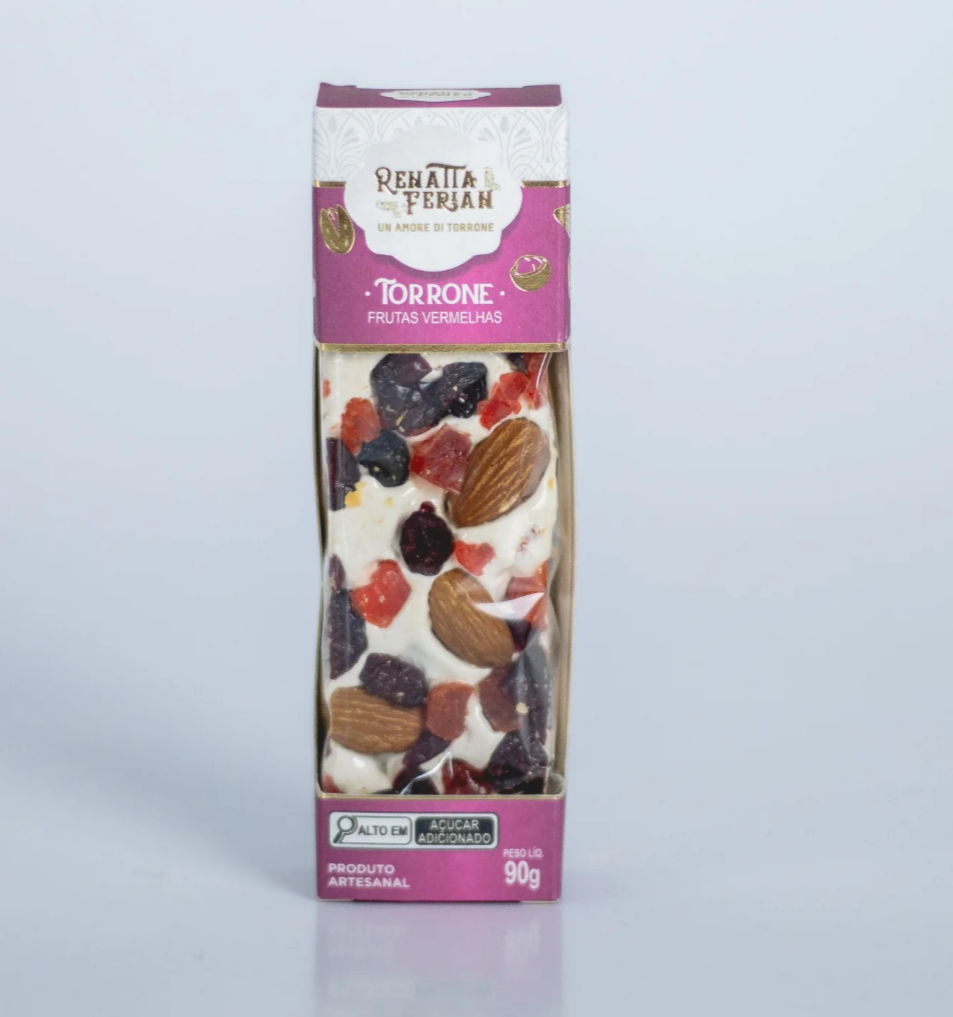 Torrone de Frutas Vermelhas com: amêndoa, mel, glucose em pó, glucose líquida, albumina pura, morango, cereja, cranberry, mirtilho, papel arroz, conservante dióxido de silício.