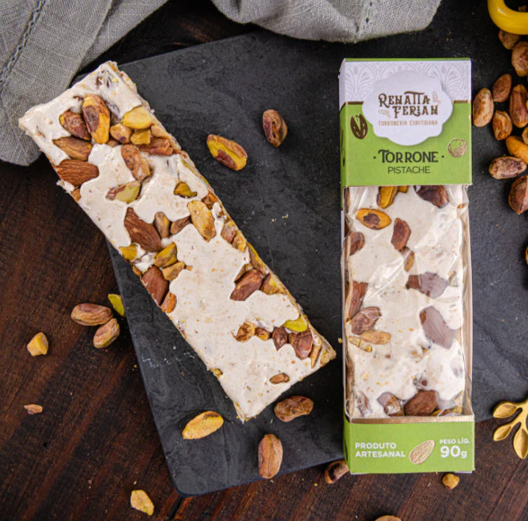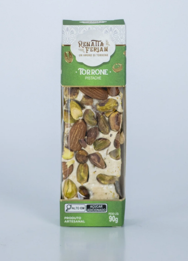 Torrone de Pistache com: pistache, mel açúçar, amêndoa, glicose em pó, glicose líquida, albumina pura, papel arroz, conservante dióxido de silício.